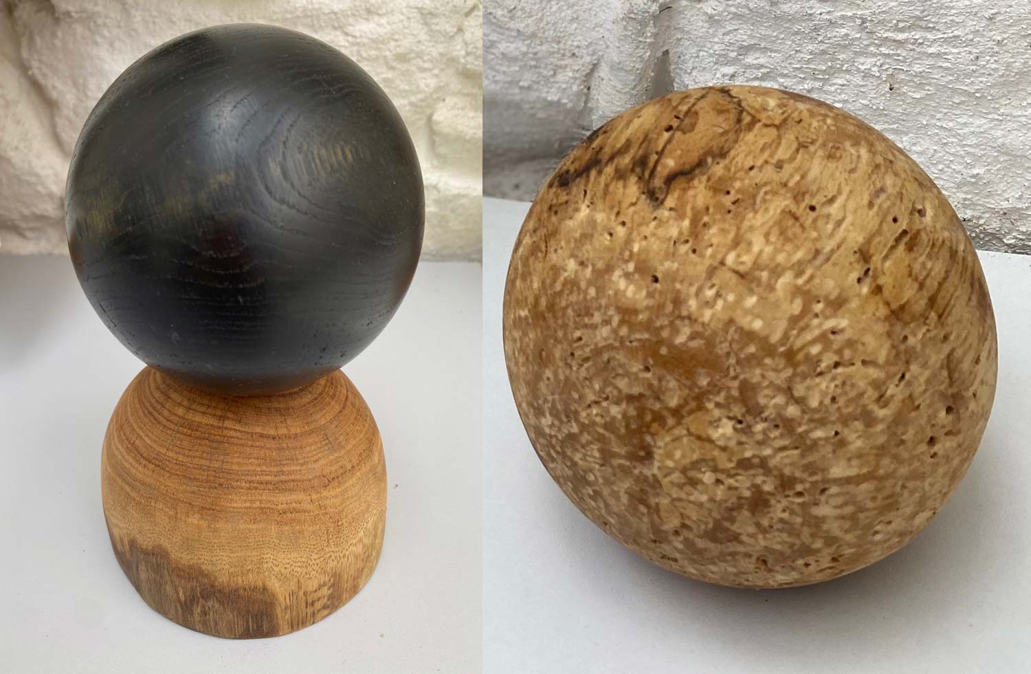 Mais Mak ne s’arrête pas là. En parallèle de ces visages miniatures, il explore aussi une forme d’art brut, sculptant de grosses boules de bois non figuratives où la matière devient personnage. Nœuds, veines, fentes, grains… il laisse parler le bois brut, le sublime dans des pièces puissantes et tactiles, loin du lisse ou du décoratif.