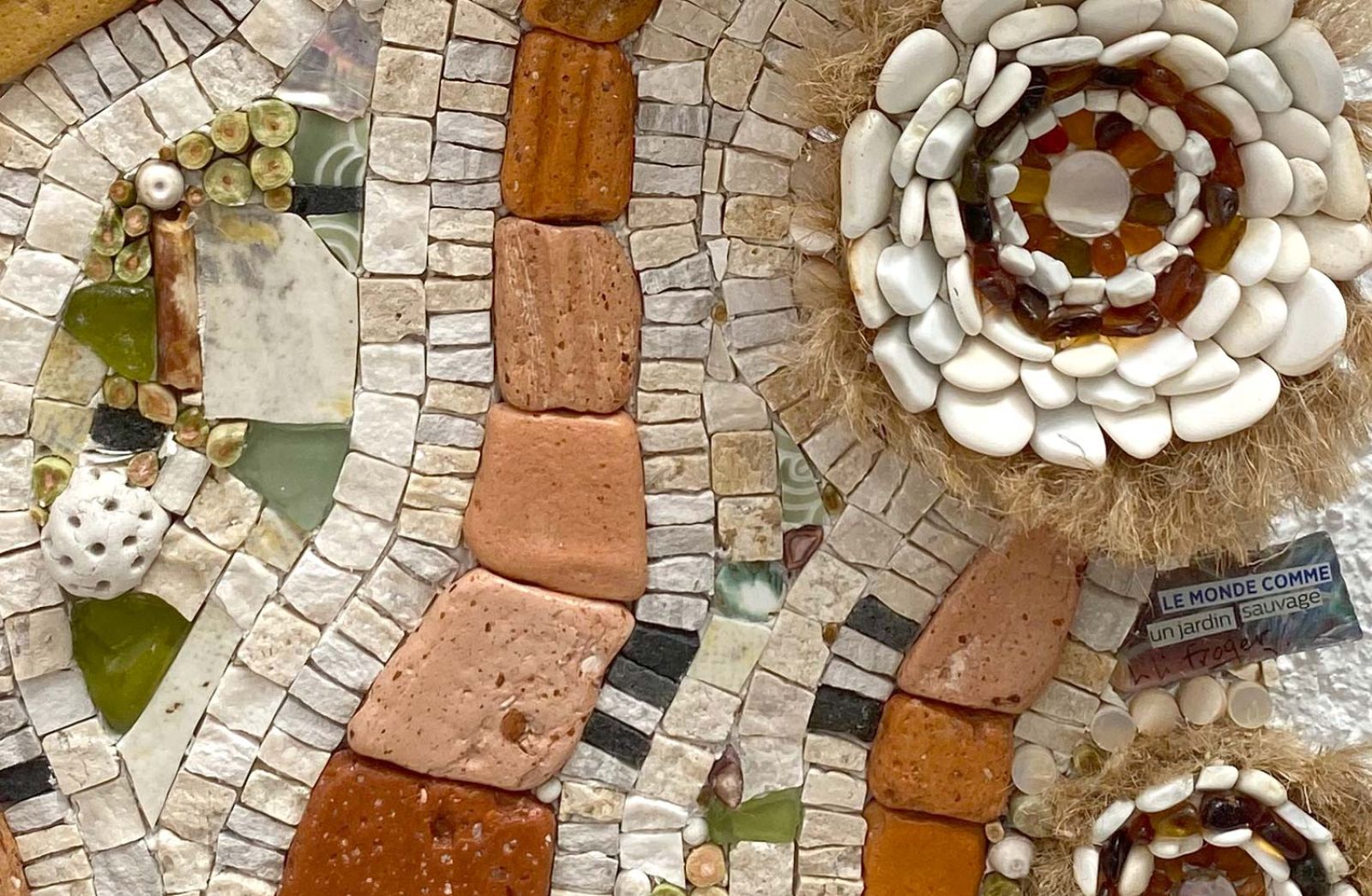 Depuis plus de trente ans, LiLi Froger façonne un art singulier, libre et engagé, à mi-chemin entre l’art ancestral de la mosaïque et la création contemporaine. Elle travaille sans acheter de matière première – à l’exception du ciment – privilégiant le recyclage de matériaux glanés sur les plages de Bretagne : verre poli, faïence, plastique, métal, bois flotté, galets, coquillages… Ces trésors échoués deviennent, sous ses mains, des tableaux poétiques et vibrants, où s’entremêlent ardoise, marbre taillé à la main, perles oubliées et parfois quelques mots de papier, comme autant d’échos aux histoires que la mer murmure.