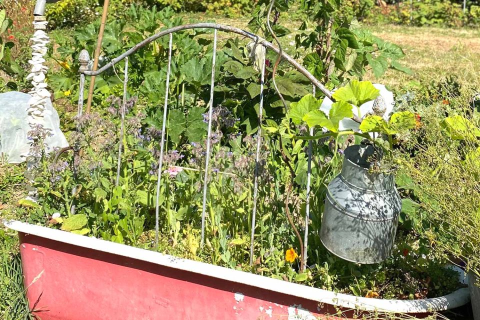 Il y règne une belle vitalité, les vivaces sont les reines, les graminées ne cèdent pas la place, les adventices prospèrent, les fruitiers (pommiers, noyer, cerisiers, noisetiers, sureaux, châtaigniers) apportent une ombre bienvenue.